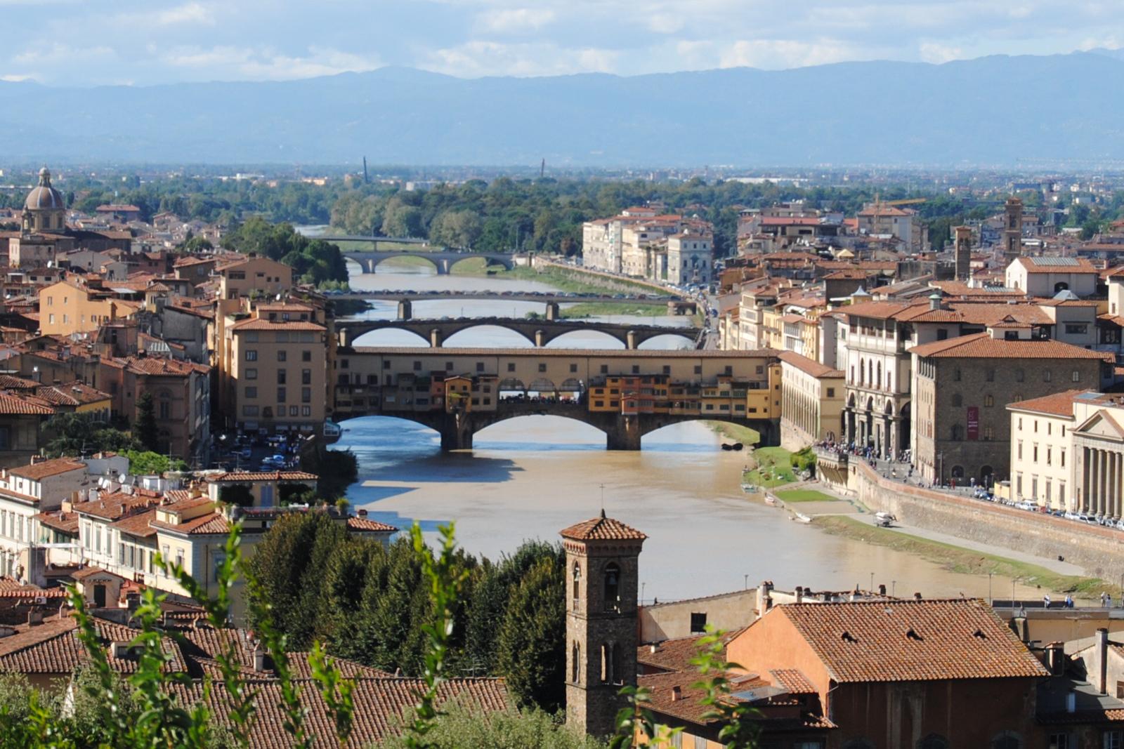 Lá está a Ponte Vecchio, uma ponte bem diferente, com um prédio em cima.