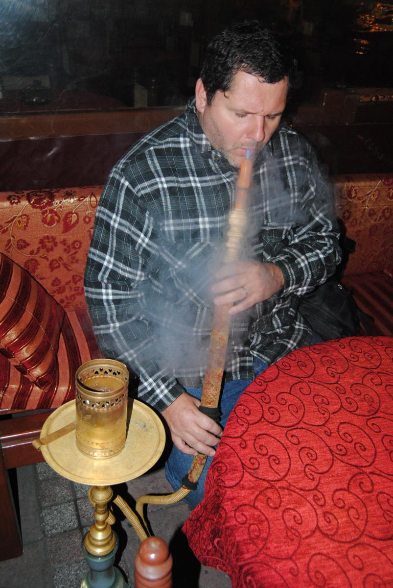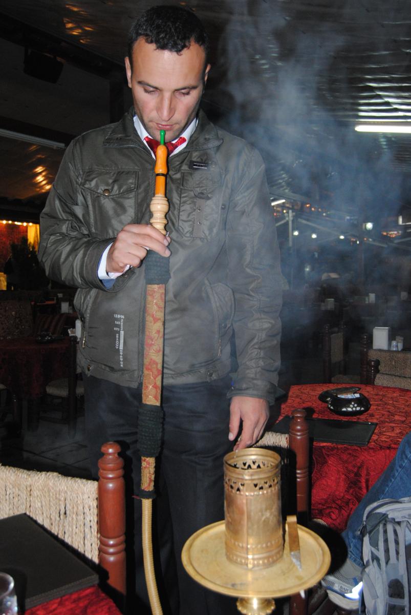 Ela estava lá toda sorridente junto com o marido que o sogrão colocou para trabalhar desde já. Familia bacana e feliz! Há quem pense que bebida alcoólica na Turquia é proibida. Ledo engano. Não é muito comum achá-la em qualquer canto, mas praticamente todas as cidades turísticas possuem alguns bons bares. Elas estão também nos supermercados a preços bem salgados. Se não tem bar vendendo alcoólica, tem bar vendendo o narguilê para degustação. Há pessoas que passam horas ali se deliciando com os diversos sabores existentes ou para experimentar pela primeira vez. Nos lugares mais tradicionais é dificil ver uma mulher fumando, somente homens, e como fomos a um bem tradicional, achei melhor respeitar. Gustavo deu alguns poucos tragos por nós...