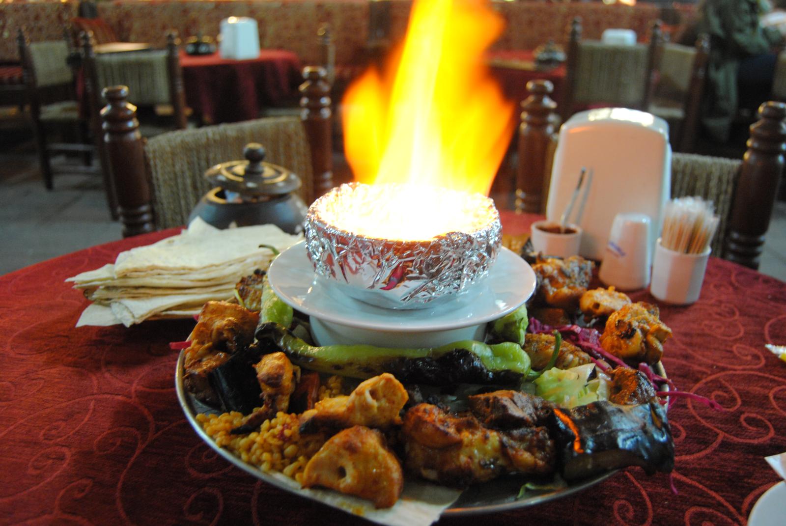 ... A deliciosa pasta de grão de bico do mundo árabe, seu lugar de origem, tabule, dentre outros, sabia que gostaria de provar os mesmos por lá, mas as comidas são tão atrativas e os cheiros são tão marcantes que cheguei querendo conhecer muito mais. Comer, dependendo do lugar na Turquia, pode ser muito bom e barato, ou muito bom e caro. Nós ficamos com a primeira opção. E, posso garantir, que é dificil sair insatisfeito com o que se come por lá, independente do quanto você gastou e onde comeu. E, sem contar também, com a hospitalidade do povo, marca registrada. Difícil esbarrar com alguém mal humorado ou mal educado. Sabendo que voce é turista, a atenção é redobrada e eles fazem de tudo para que fique satisfeito. Sorte a nossa que estávamos ali doidos para conhecer tudo de melhor que o país poderia nos oferecer. A comida turca mais conhecida pela grande maioria dos turistas é o kebap. Ele, que já comentei em alguns diários anteriores, é facilmente encontrado em diversos países da Europa. A diferença é que na Europa, ele é servido, na maioria das vezes, como um sanduíche, e na Turquia não. Além do sanduíche, ele é também servido de diferentes formas. Em Istambul, num restaurante bastante turístico, porém com muitos turcos presentes, experimentamos o kebap misto.
