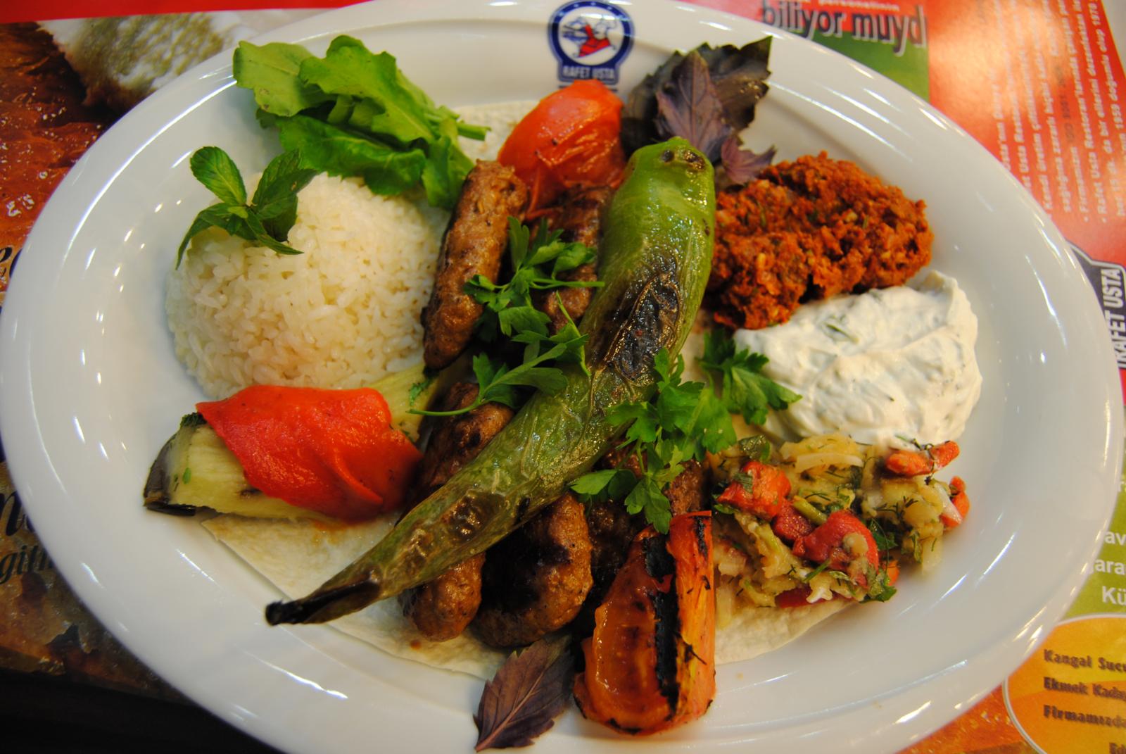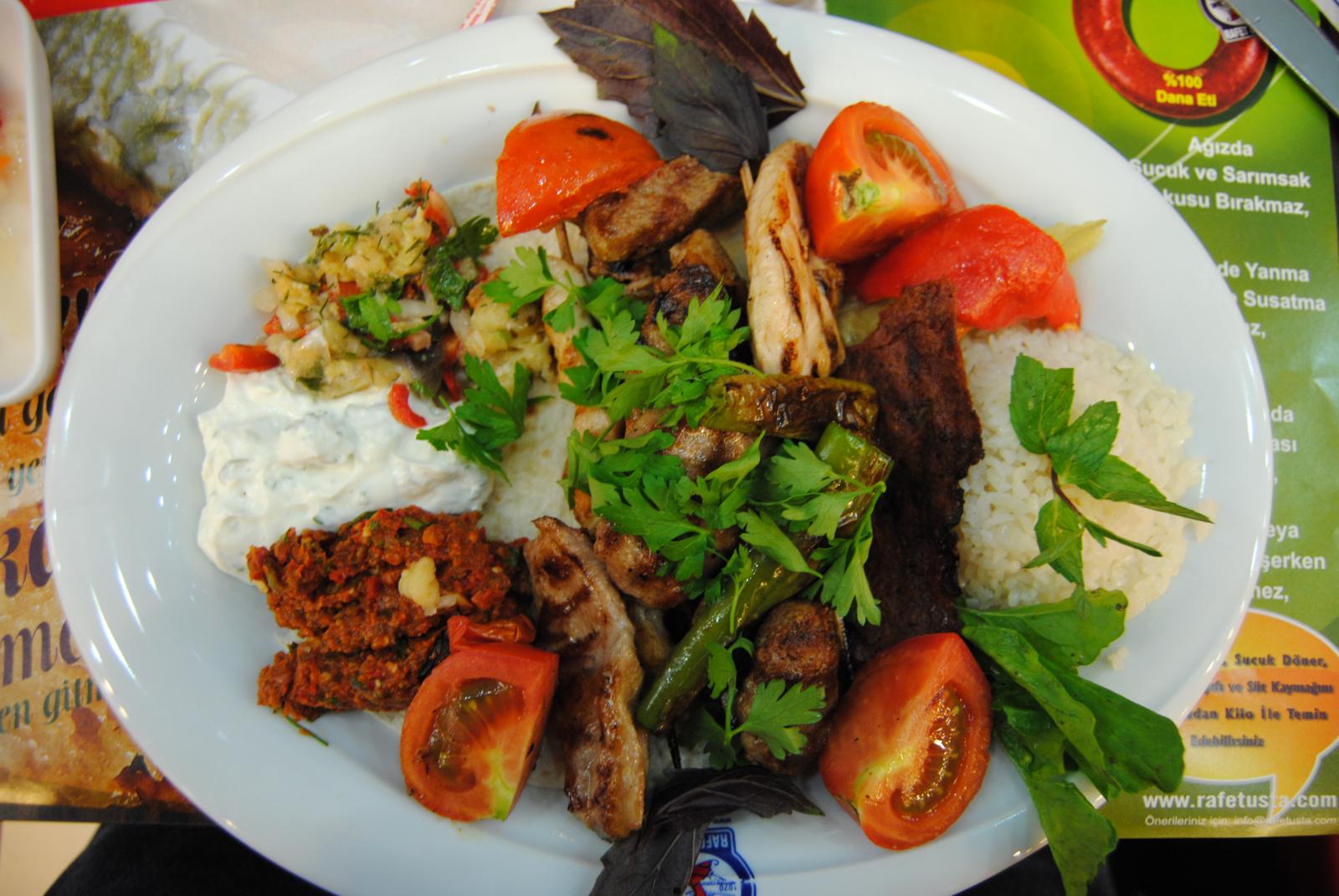 Eu achei bastante indigesto, mas ele é muito consumido por lá. Os turcos comem muito bem. Apesar de existirem as famosas redes de fast foods nas principais cidades do pais, eles gostam mesmo é de fazer refeições completas. O que estão longe de estarem errados visto à qualidade da comida e do seu sabor. Os legumes e verduras estão presentes em praticamente todos os pratos, como nestes dois: Karisik Izgara Kebap, o kebap...