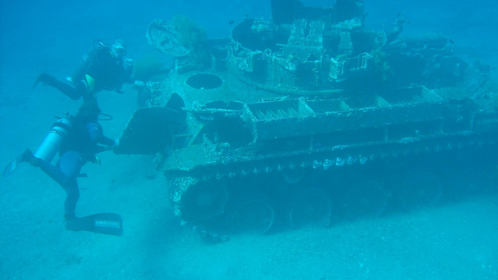 Despretensiosamente cruzamos com um tanque de guerra no fundo do mar.