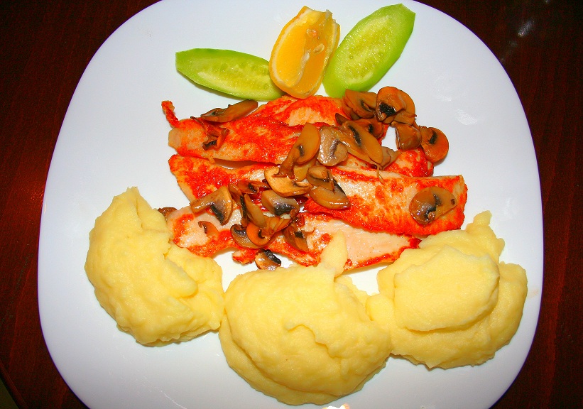 Prato com peito de frango, também acompanhado por batata. Desta vez por purê.