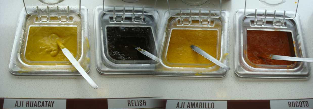 Além de “ají amarillo”, a famosa pimenta peruana amarela, o “ají huacatay”, também pimenta e especialmente preparada para comer com batatas, “relish”, doce de pepino, e o “rocotto”, um forte tempero, parecido com pimenta, cultivado nos Andes. Esses temperos são bem fortes e vão deixar seu sanduba diferente.