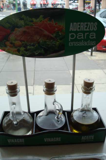 Se você gosta de “junkie food”, aqui no Peru, no Mac Donalds especificamente, há molhos que não são servidos no Brasil. Eles oferecem como “aderezos para ensaladas” azeite, vinagre e vinagre de “manzana”, ou maçã.