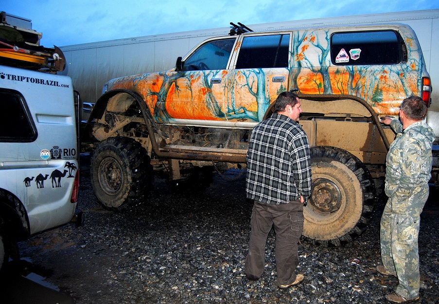 E o cara me aparece com uma Toyota Land Cruiser de quatro metros de altura, pneus gigantescos, motor de caminhão alemão, eixo de trator e o "escambal".