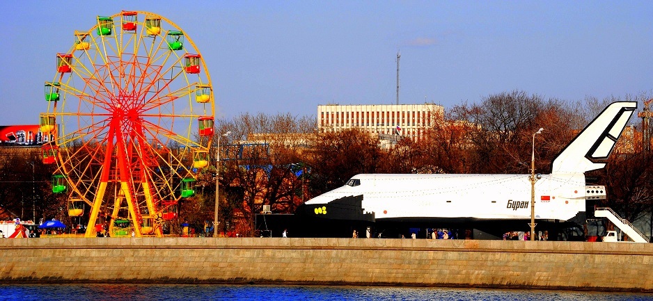 A Rússia também tem seu ônibus espacial, e sua réplica encontra-se no parque de diversões da cidade.