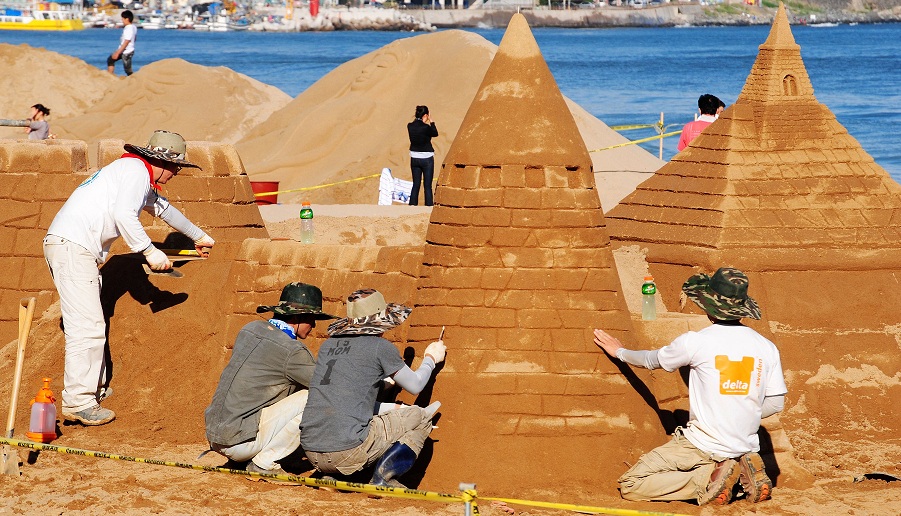 Lá, estava acontecendo um campeonato de castelos enormes feitos de areia!