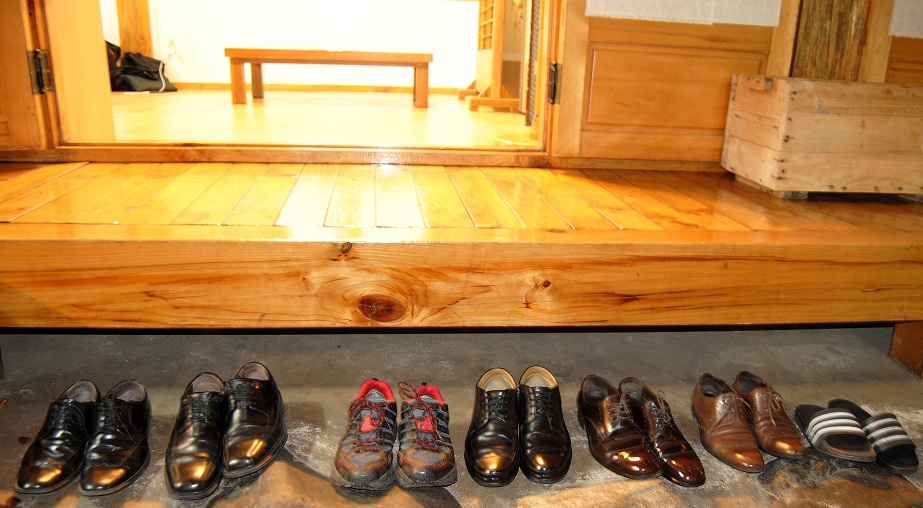 Nos locais mais tradicionais do país, sapatos não entram. E, depois disso, sentamos ao chão... Restaurante tradicional coreano não possui cadeira... Adoramos!