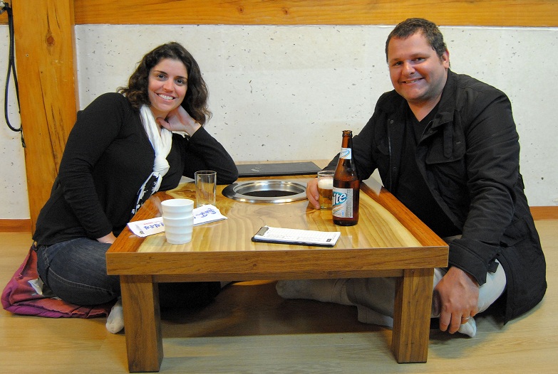 A Coréia do Sul foi para nós uma linda e deliciosa surpresa! Como temos restrições para visitar certos países, por causa do Tapa, nossa visita à Coreia do Sul deu pra matar um pouquinho da curiosidade do que seria conhecer o Japão e a China. Tá certo que cada país tem suas peculiaridades, mas lá deu para ter uma boa noção de como é a vida desses países tão distantes e diferentes do nosso estimado Brasil. Tivemos a oportunidade de ver com nossos próprios olhos, a gentileza e cordialidade dos orientais e o exemplo do respeito ao próximo. Fomos tratados como reis onde quer que fôssemos e cada passeio era diversão garantida. A curiosidade que eles tinham em saber de onde vinhamos, e agitação que eles ficavam com o nosso querido Tapa era simplesmente encantador! Ah! E não posso me esquecer do orgulho que eles tinham em dizer, em inglês, que eram coreanos. Eles amam sua pátria e têm orgulho da sua história. Definitivamente, foi muita sorte estarmos ali e estávamos mais que prontos para conhecer um pouco do país mais distante que poderíamos ir em nossa viagem de volta ao mundo. Estávamos, literalmente, do outro lado do mundo! Nossa primeira parada foi na histórica cidade de Gyeongju, no extremo sudoeste do país. Chegamos varados de fome após viajarmos a tarde inteira pelas excelentes estradas sul coreanas e fomos direto catar um lugar para jantar. E, para nossa sorte, não poderíamos ter encontrado um lugar melhor. Já de cara tivemos que começar a nos adaptar aos costumes locais e tiramos nossos sapatos para entrar no restaurante...