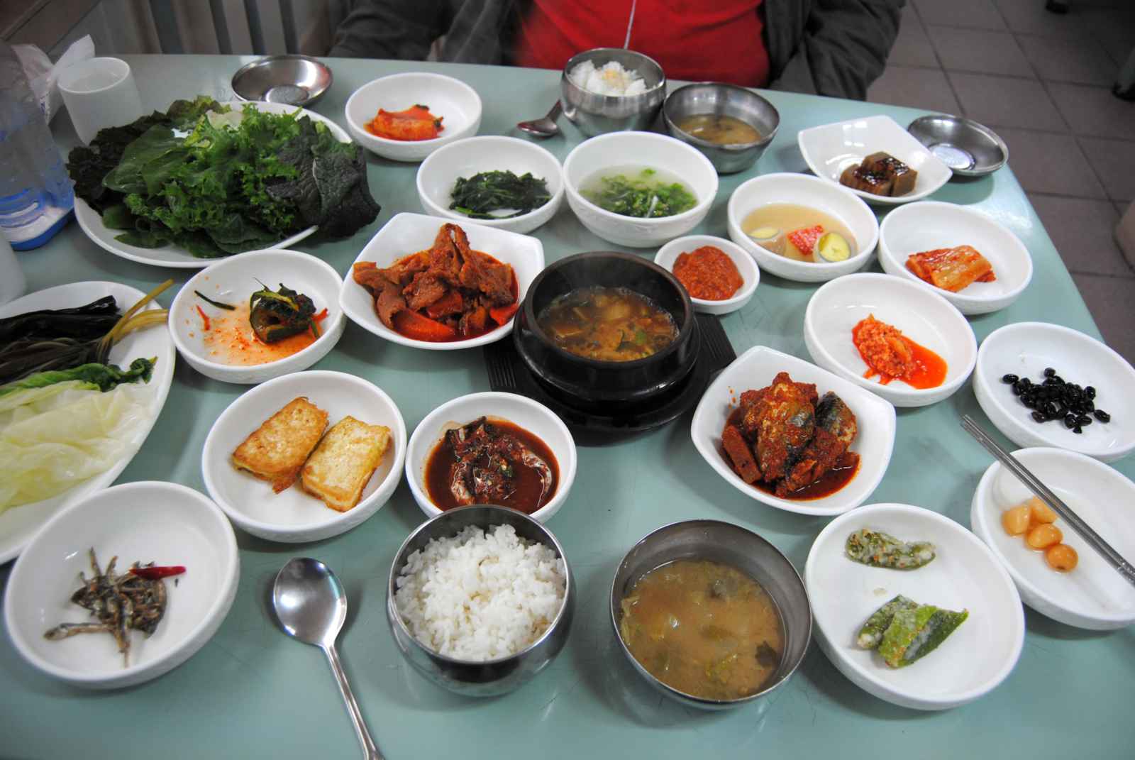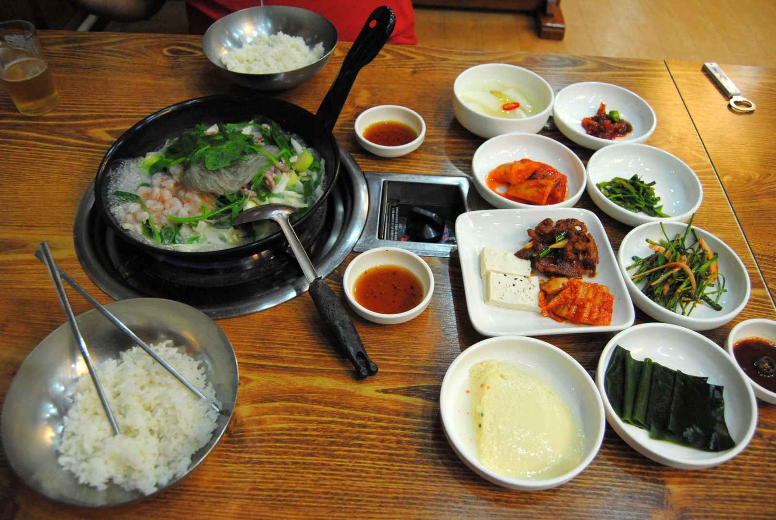 O principal elemento das refeições do país, chama-se kimchi, uma conserva de vegetais preparados com acelga e rabanete, e que hoje em dia é consumido até no café da manhã. E, por falar em café da manhã, a primeira refeição do dia, definitivamente, não é a especialidade dos caras, principalmente para nós ocidentais. É comum alguns hoteis não servirem a primeira refeição do dia e, os que servem... Prefiro dizer que são bem diferentes dos nossos, hehehe. Eles comem de tudo... Até peixinho frito e arroz. Então, recorríamos às centenas de lojas de conveniência espalhadas por todo o país. Para comer, você pode utilizar a mão, como fazem os mais tradicionais, ou o hashi de inox, o famoso pauzinho oriental, e colher. Eles não utilizam faca. Água por lá é servida de graça e refrigerante quase não se vê nos restaurantes, mas se você pedir tem. Os coreanos mais tradicionais têm o costume de não conversar à mesa, pois a comida, para eles, é para matar a fome e não para ser saboreada. Ah! Não deixe resto de comida no prato, pois esse é o sinal máximo da falta de educação e de que não gostou do que comeu. Eles ficam super sentidos com isso. Para quem está de dieta, visitar a Coreia é uma "mão na roda"! As refeições são muito saudáveis e quase não há fritura. Se você gosta de comida apimentada tambem irá tirar a barriga da miséria... Para eles, quanto mais pimenta melhor.