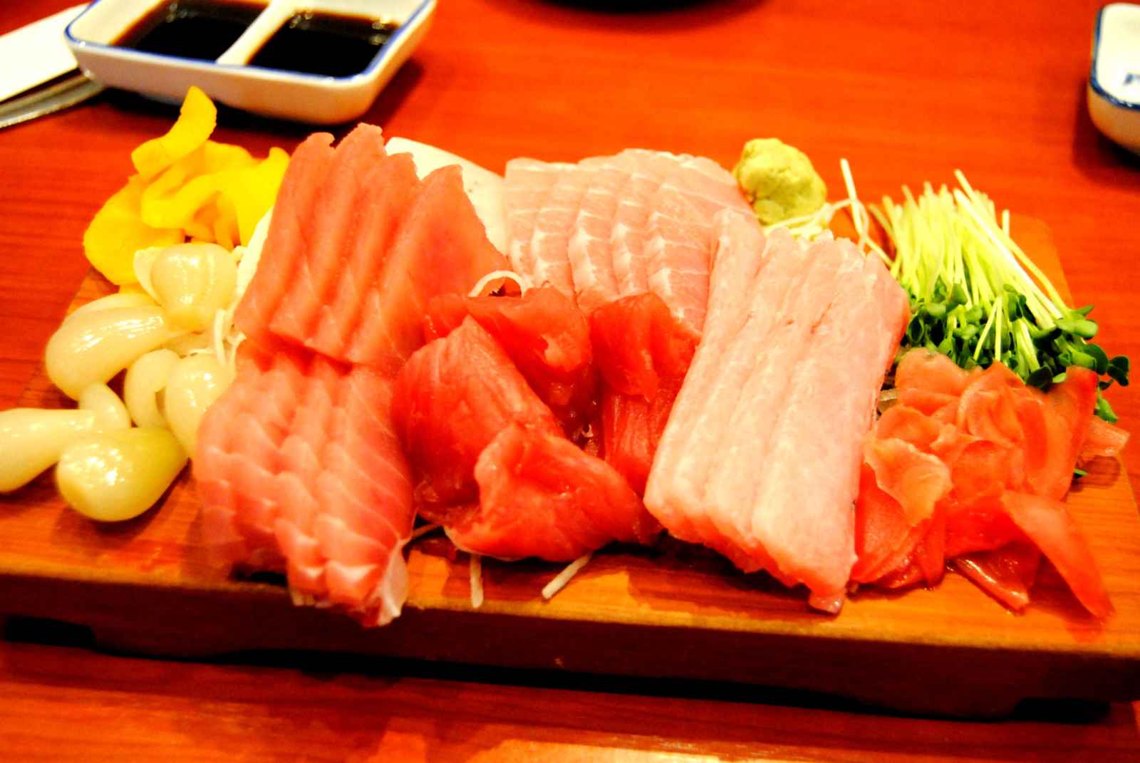 Aproveitando a proximidade com o Japão, nos deliciamos com sahismis de salmão para comemorar nossa visita ao país.