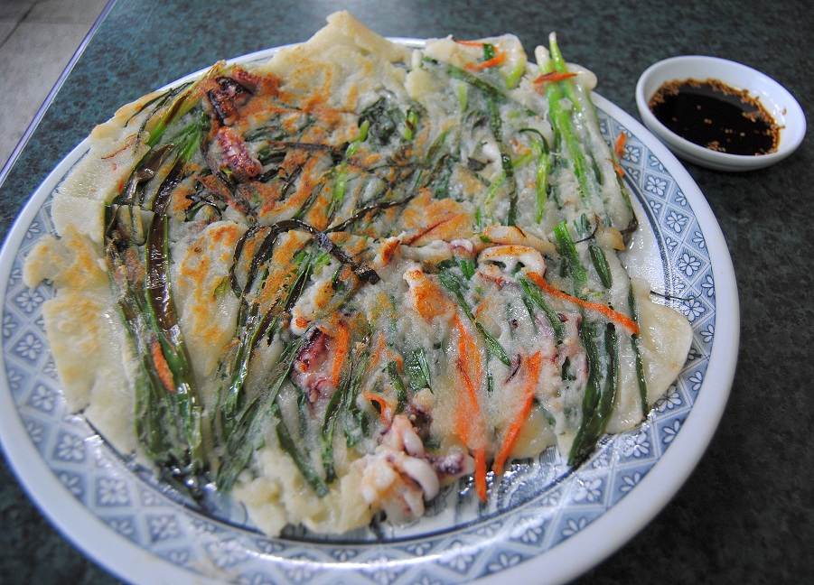 O Pajeon, uma espécie de fritada de legumes e frutos do mar, foi pra mim uma das comidinhas mais gostosas. A aparência é de um grande omelete, e é muito gostoso. Uma pitadinha de pimenta e pronto! Taí uma refeição leve e saudável para aproveitar o resto do dia. Comemos este prato algumas vezes!