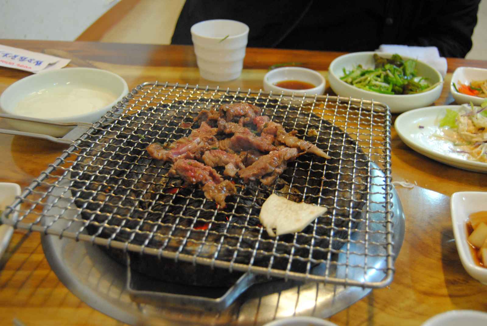 Logo depois, fomos rapidamente atendidos por uma das donas do restaurante que nos mostrou o cardápio com suas indecifráveis letrinhas, mas com tradução em inglês! Oba! E ela nos indicou o tradicional churrasco coreano, o bulgogi.