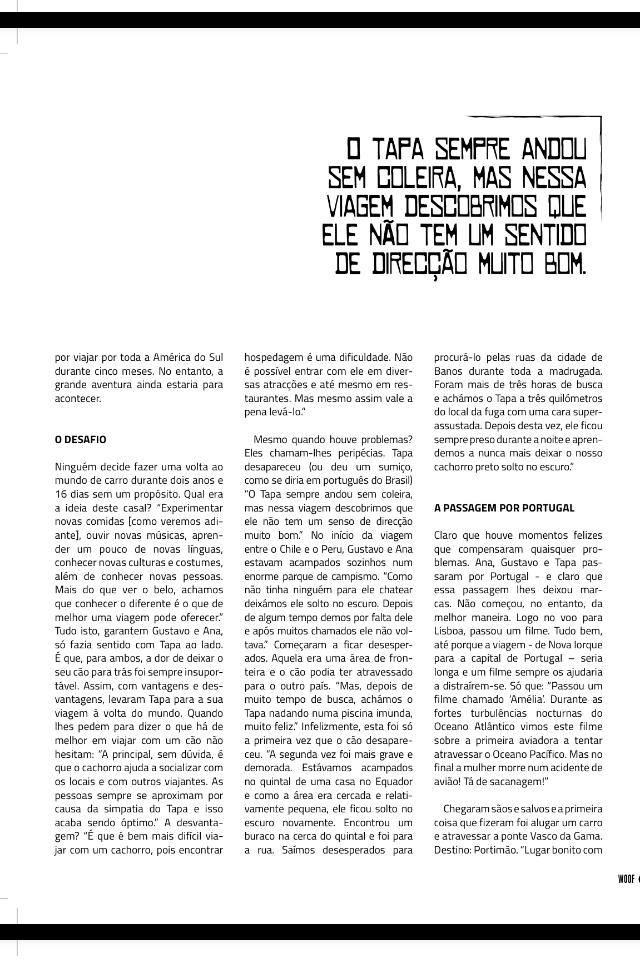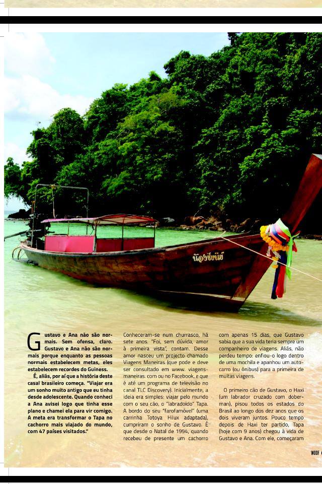 ...De viagens com animais, o administrador de empresas Gustavo Vivacqua entende. Ele e seu cão Haxi, um mestiço de dobermann com labrador , de 8 anos, já conhecem quase o Brasil inteiro. Por não encontrar facilidade com hotéis que aceitem seu cachorro, Vivacqua, transformou a parte traseira de seu carro num quarto para Haxí, com direito a ventilador e caminha. E quando o cão não é bem-vindo em restaurantes ou pousadas, fica dentro do automóvel. Mas (que, fique bem claro) estacionado na sombra, e com uma fresta da janela aberta para o bicho não sufocar. Outro cuidado que as pessoas precisam ter é com veneno de rato É comum em canteiros de cidades pequenas. Por isso , é melhor que o cão fique na coleira - ensina Vivacqua, responsável pelo site Viagens Maneiras (www.viagensmaneiras.com.br), que tem Haxi como personagem principal, aparecendo em todas as fotos...